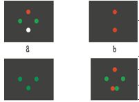 被检者戴红、绿眼镜,右眼为红色,左眼为绿色,观察33cm6m处的四点灯。四点灯一个红色,两个绿色和一个白色。如被检者看到四个灯,说明有双眼单视;若为22绿,说明右眼为主导眼;若见3绿1红,说明左眼为主导眼;若仅见2个红灯或3个绿灯,说明有单眼抑制;