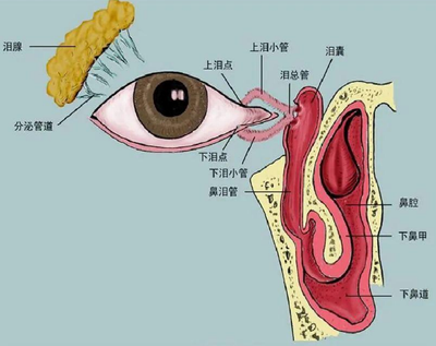 上与泪囊相接,下端逐渐变窄,开口于鼻道内。鼻腔疾病可引起泪道感染或鼻泪管阻塞,而发生溢泪。