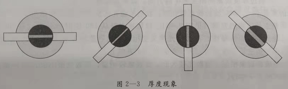 2)厚度现象(见图2-3).当360°旋转光带时,球面性的屈光不正表现为瞳孔区反光带的宽度保持一致,而散光性屈光不正则表现为各方向的宽度的不一致,即厚度现象。