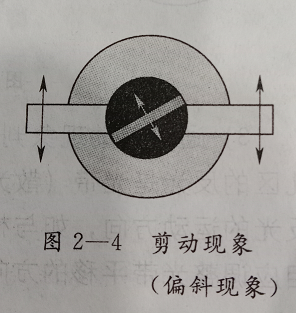 当检影镜光带与两主子午线方向不相一致时,瞳孔区反光带的运动方向与检影镜光带的平移方向不一致,即为剪动现象,又称偏斜现象。在球面性屈光不正中不存在剪动现象。