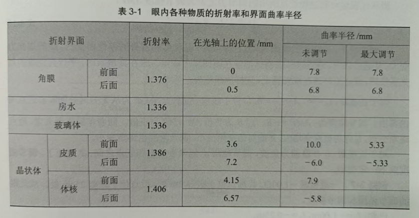 眼内各种折射媒质的折射率与界面的曲率半径如表3-1所示,其中晶状体的折射率取把它看作是均匀物质时的等效值。